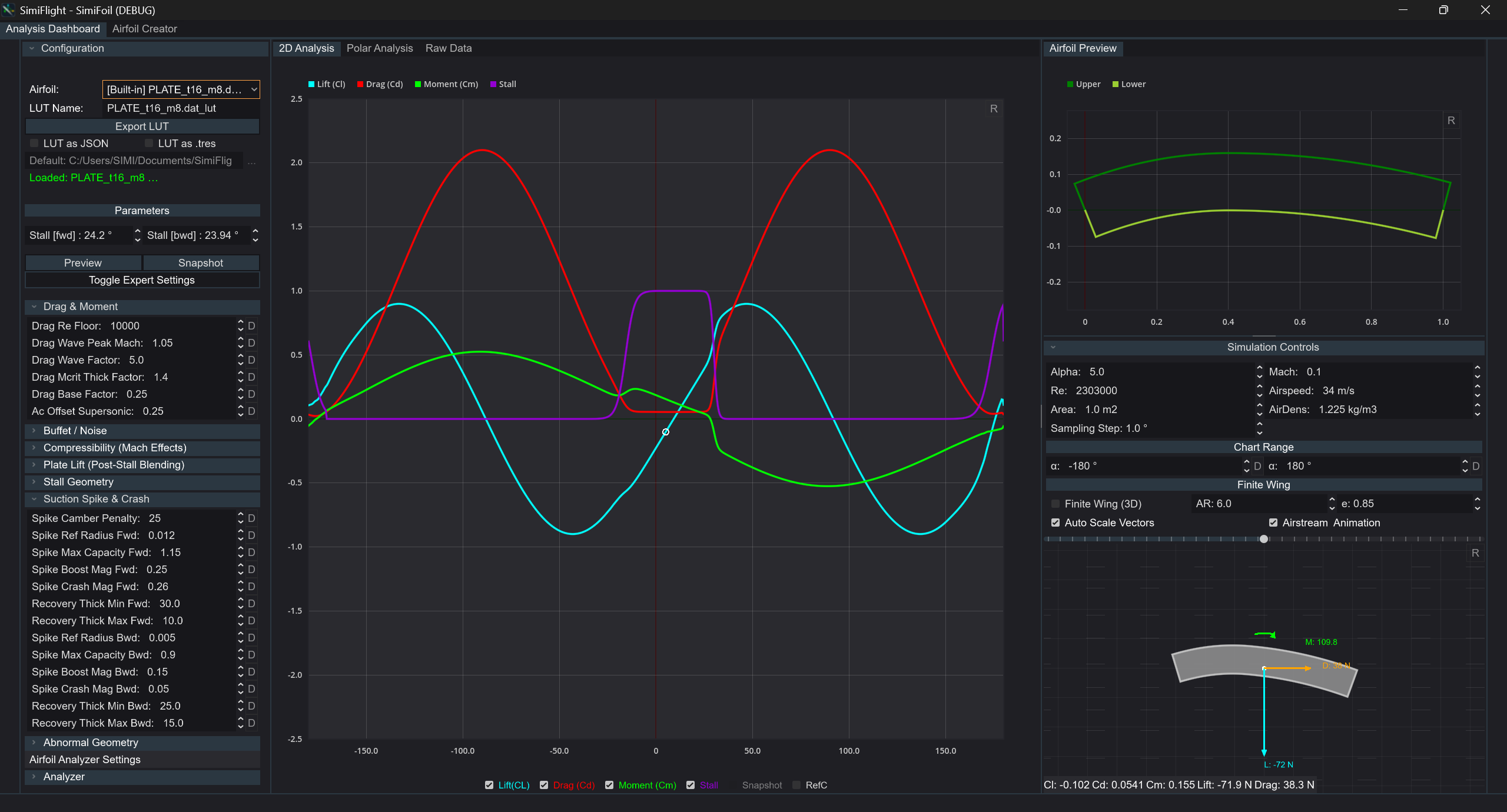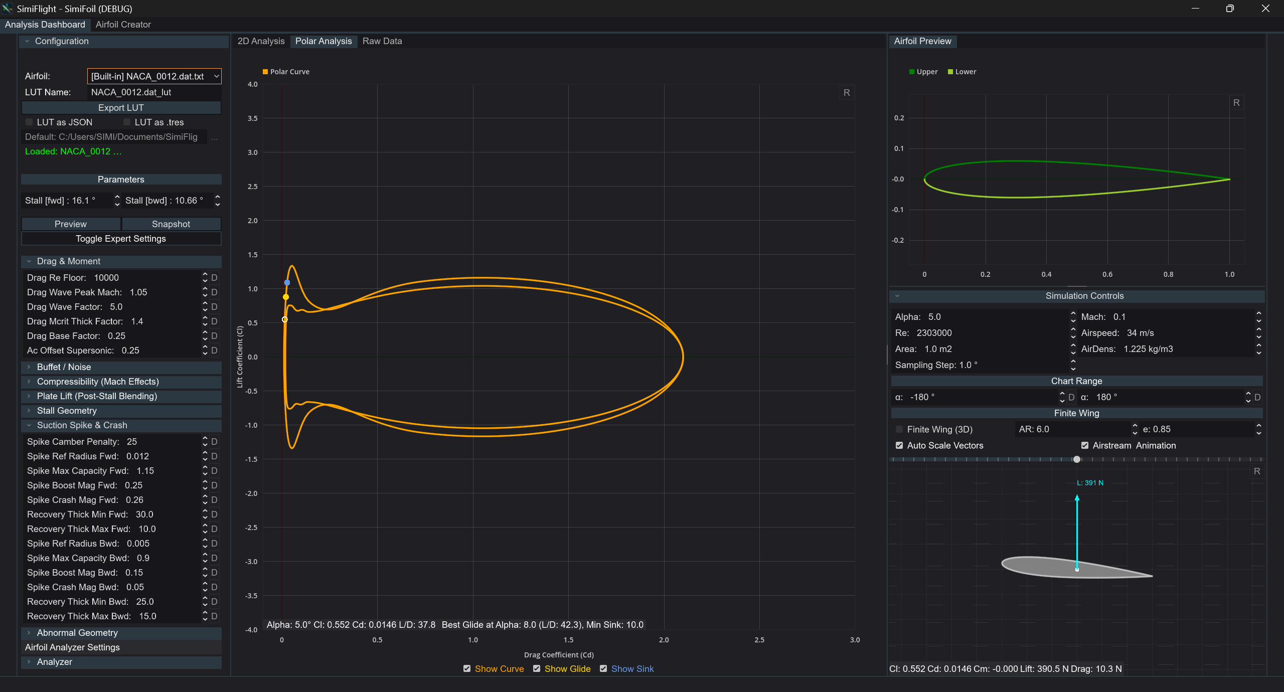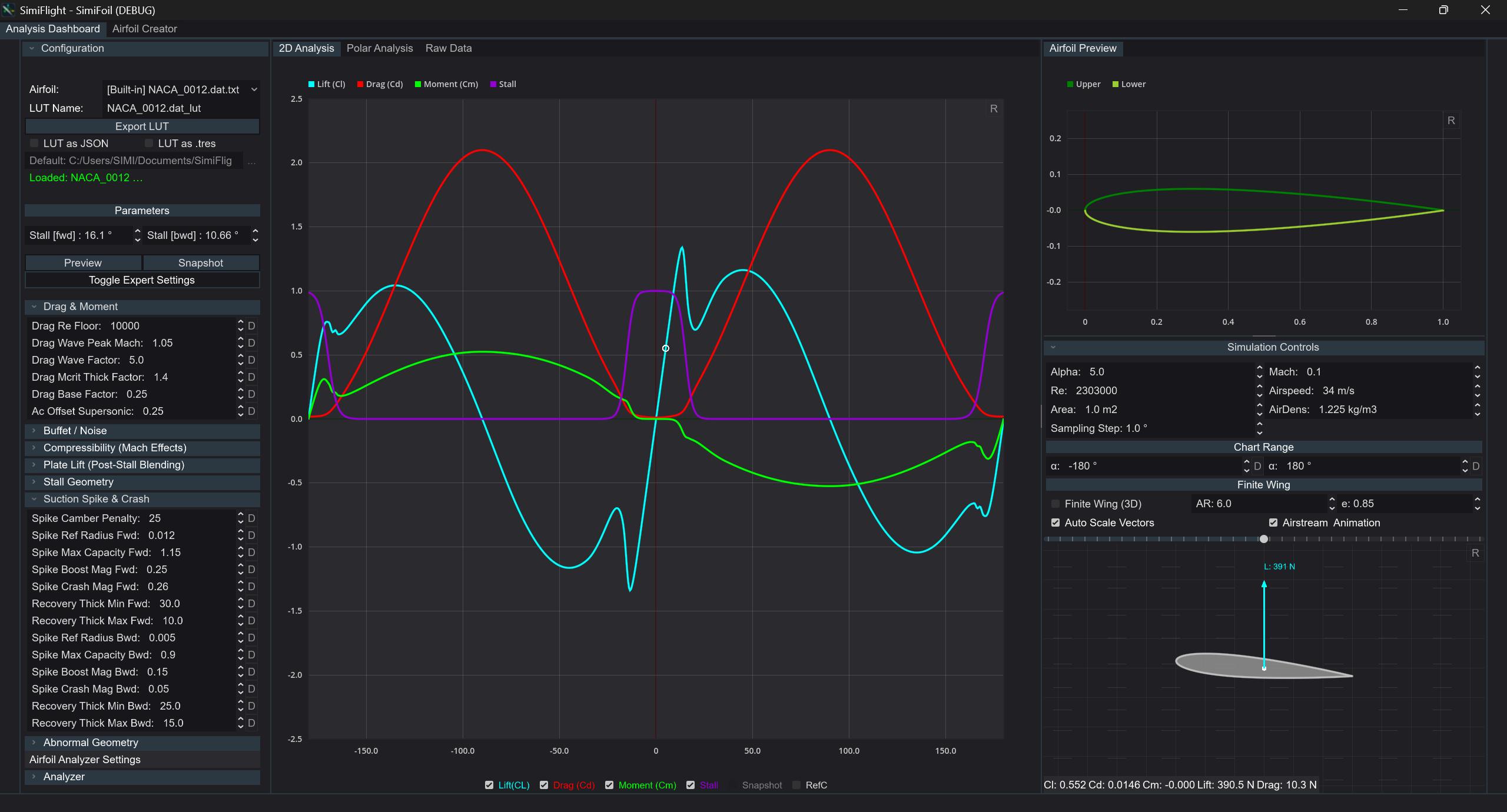 SimiFoil is a lightweight aerodynamic curve generator for flight simulators, RC aircraft, and game engines. SimiFoil originated as part of my flight simulator project SimiFlight, but is designed to be used as a standalone tool.